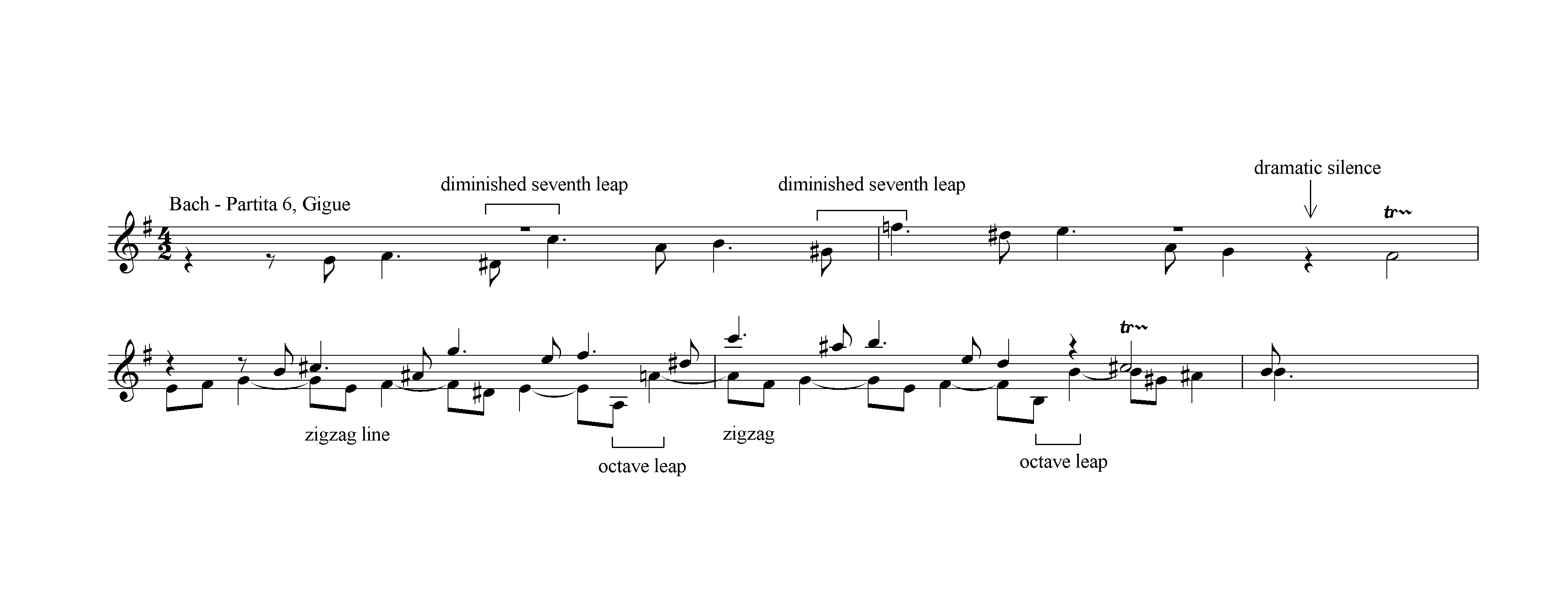 So if the gavotte plays the role of the gigue, what music does Bach write for the gigue itself to conclude the partita? Instead of the usual cheerful, happy-go-lucky tone of his other gigues, for this partita he composed an intense, angular fugue, very serious and gritty. The melody of the fugue’s theme has big arching upward leaps, using the unusual jump of a diminished seventh, and has a dramatic silence in the middle of the line, while its countermelody contrasts with its own distinctive character, comprised mostly of small zig-zag motions where each new note of the line goes alternately up and down, separated by occasional upward octave leaps, so a leap even a little larger than the already large leaps of the opening melody. The beginning of the gigue is pictured below: